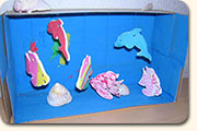 Wir stechen gemeinsam aus lufttrocknendem Ton Fische aus bzw. schneiden welche aus Pappe aus. Bitte zum Aufhängen kleine Löcher hineinbohren. Die Ton-Meeresbewohner müssen nun 24 Stunden trocknen.