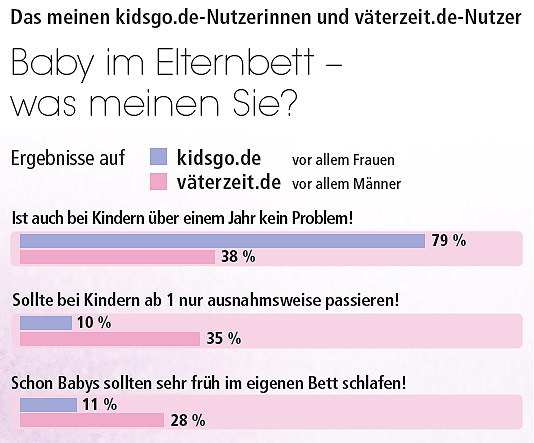 Ganz anders die Männer: Nur 38 Prozent meinen, es sei kein Problem, wenn Kinder über einem Jahr im Ehebett nächtigen. Von den Frauen haben mehr als doppelt so viel diese Antwort angeklickt. Den Trend bestätigen auch die anderen Antworten: 35 Prozent der Männer meinen, ausnahmsweise eine Nacht im Elternbett sei kein Problem. Und schon früh das Baby ans eigene Bett gewöhnen wollen 28 Prozent der Männer.