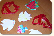 Wir stechen gemeinsam aus lufttrocknendem Ton Fische aus bzw. schneiden welche aus Pappe aus. Bitte zum Aufhängen kleine Löcher hineinbohren. Die Ton-Meeresbewohner müssen nun 24 Stunden trocknen.
