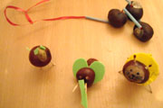Für den Elefanten verbinde zwei Kastanien mit einem Zahnstocher oder Streichholz. Dazwischen kommen noch die Ohren, ausgeschnitten aus Filz oder Moosgummi. Jetzt kannst du das Gesicht aufmalen oder als Augen zwei Streichholzköpfe verwenden und den Rüssel – ebenfalls aus Moosgummi oder Filz – aufkleben. Die Stoßzähne sind halbe Zahnstocher. Wenn die Kastanien noch frisch sind, kannst du sie relativ leicht mit Zahnstochern bestücken. Für den Hund oder die Kuh (oder was auch immer du in dem Tier links auf dem Bild sehen möchtest) nimmst du als Kopf eine Eichel und als Beine vier halbe Zahnstocher. Die Ohren und der Schwanz sind wieder aus Moosgummi.