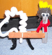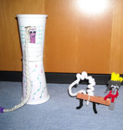 Dann kommt der Prinz auf seinem feurigen Ross (aus Draht einen Kopf und zwei Beinpaare zurechtbiegen und in die Wäscheklammer einklemmen) angeritten und ruft laut „Rapunzel, Rapunzel – lass Dein Haar herab...!“