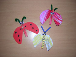 Lustige Gesellen sind auch die bunten Flattermänner aus Holz-Wäscheklammern. Ihr Kind bemalt die Klammern bunt und malt oder klebt Augen und einen Mund auf. Die Flügel werden als Kreis auf buntes Papier gezeichnet und ausgeschnitten. Dann den Kreis fast vollständig halbieren und aufschneiden. Nun können Sie die Flügel in die Wäscheklammer einklemmen. Niedlich sind noch ein paar Fühler aus buntem Plüschdraht.