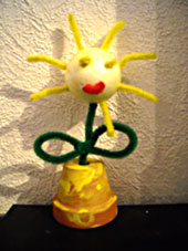 Du benötigst eine Styroporkugel, einen kleinen Blumentopf, etwas Farbe (Wasser- oder Fingerfarbe) und bunten Basteldraht. Der Blumentopf wird von Ihrem Kind bunt bemalt und kann trocknen. Die Styroporkugel bekommt nun Blütenblätter aus Basteldraht. Das Gesicht der Blume kann aufgemalt werden oder auch aus kleinen Drahtstücken gesteckt werden.