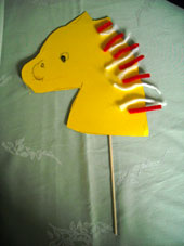 Kleine oder große Steckenpferde können Sie einfach und schnell aus einem Stück Pappe herstellen. Einen Pferdekopf aufzeichnen und ausschneiden, Gesicht aufmalen und als Mähne ein paar Wollfäden aufkleben. Dann einen Schaschlikspieß oder einen Stock mit Tesafilm dahinter kleben – los geht´s. Hübsch als Deko im Blumentopf oder mit einem Willkommensgruß vor der Türe.