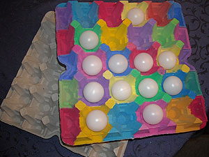 Durch das Loch schiebst du die Schnur und verknotest das Ende mehrmals. An das andere Ende wird der Korken oder die Styroporkugel gebunden. Hier kann noch ein Gesicht aufgemalt werden. Nun geht es los – wer schafft es - fang das Kerlchen.