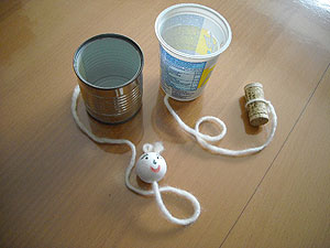 Du benötigst eine leere Dose oder einen Plastikbecher, etwas Schnur, einen Korken oder Styroporball, ein paar Stifte und einen Nagel o.ä. Mithilfe des Nagels oder einer Schere haust du vorsichtig ein Loch in den Boden der Dose. Bei dem Plastikbecher kannst du das Loch mit einer Schere reinpieksen.