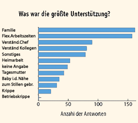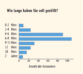 Beim Wiedereintritt ins Berufsleben stillten noch 83 Prozent der Befragten – die meisten von ihnen voll. Teilweise gestillt wurde vornehmlich von Müttern mit handwerklichen und technischen Berufen. Wer zum Zeitpunkt des Berufseintritts voll stillte, blieb meist noch 4-5 Monate lang dabei, um danach 2-3 Monate lang teilweise zu stillen.