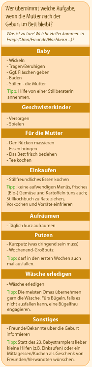 Bitte nutze diese Zeit! Hausarbeit wie waschen, bügeln, aufräumen oder einkaufen, solltest du dabei auf ein Minimum reduzieren. Nimm jetzt jede angebotene Hilfe skrupellos an – die Chance kommt frühestens bei der nächsten Geburt wieder. Besprich mit deinem Partner am besten vor der Geburt, wer danach welche Pflichten übernimmt. Berücksichtige dabei persönliche Vorlieben. Unsere Wochenbett-Liste hilft dabei.