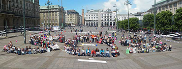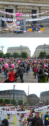 Rund 500 Frauen, Männer und Kinder haben am 26. Juni 2014 zusammen mit den Hebammen in Hamburg demonstriert. Anlass war die dort stattfindende Konferenz der Gesundheitsminister. Der Göttinger kidsgo-Verlag brachte „Die längste Nabelschnur der Welt“ mit. kidsgo hatte diese Idee zu der in Göttingen initiierten Demo im Februar entwickelt. Seitdem wurden überall in Deutschland Nabelschnurstücke mit Appellen an den Gesundheitsminister und Danksagungen an die Hebammen behängt. So unterschiedlich die „Nabelschnüre“ auch waren, die Forderungen an die Politik sind immer die Gleichen: Das Grundrecht auf eine 1:1 Betreuung durch eine Hebamme vor, während und nach der Geburt und auf die freie Wahl des Geburtsorts. Dies ist nachweislich am sichersten und gesündesten für Mutter und Kind und senkt langfristig die Gesundheitskosten