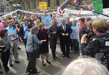Der Bundesgesundheitsminister war kurzfristig als Gast bei der Konferenz anwesend. Inmitten des durch die Nabelschnur gerahmten Platzes nahm er nun auch endlich die von Bianca Kasting gesammelten 424.000 Change.org-Unterschriften für den Erhalt der Hebammenbegleitung offiziell entgegen. Vom Deutschen Hebammenverband, die Demo und Kundgebung organisiert hatte, bekam Herr Minister Gröhe zudem eine Landkarte der Unterversorgung überreicht. Darauf wird deutlich, dass überall Hebammen fehlen. Geburtsstationen und Geburtshäuser schließen und oft finden Frauen keine Beleghebamme mehr - es betrifft schon jetzt neben den ländlichen Bereichen auch immer mehr Städte.