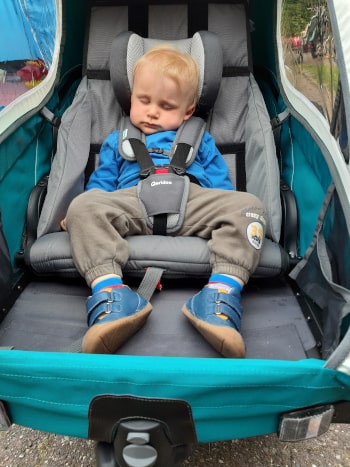 Angelika aus Berlin: „Definitiv! Unser Kind liebt den Anhänger. Wir freuen uns allerdings sehr darauf wenn sie sitzen kann. Mit der Babyschale geht Stauraum hinter dem Kind verloren und vor dem Baby platzieren wir nur leichte und ungefährliche Dinge.“