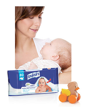 Toujours Sensitive Feuchttücher: Frei von Parfüm bringen sie selbst Babys mit empfindlichster und zu Allergien neigender Haut zum Strahlen. Eine sehr milde Gel-Lotion pflegt die Babyhaut dabei überaus schonend und schützt sie vor dem Austrocknen.