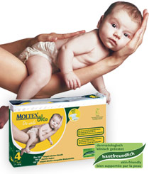 Mit der Ergänzung „Die weiße“ stellt die MOLTEX Baby-Hygiene GmbH aus Mayen Ihrem Baby ein Produkt mit noch mehr Vorzügen für das Wohl Ihres Kindes und zur Schonung der Umwelt zur Verfügung. Hergestellt wird die MOLTEX Öko Höschenwindel mit über 50 % biologisch abbaubaren Rohstoffen. Der 100 % chlorfreie weiche Saugkern kommt insbesondere Kindern mit empfi ndlicher Haut zugute. Die MOLTEX Forschung arbeitet stetig an einer Steigerung der eingesetzten umweltfreundlichen Rohstoffe. Die atmungsaktive Wäscheschutzfolie ist sogar zu 100 % kompostierbar und lässt Luft an die Haut Ihres Kindes. Das superweiche Abdeckvlies besteht zu 40 % aus nachwachsenden Rohstoffen.