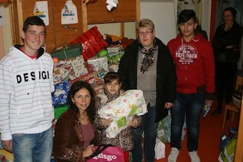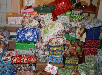 Die Übergabe der zweiten Runde von über 200 Geschenken an die Flüchtlingskinder.