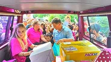 12. August 2015: Geschenkeverteilung in der Menge direkt aus dem Bus