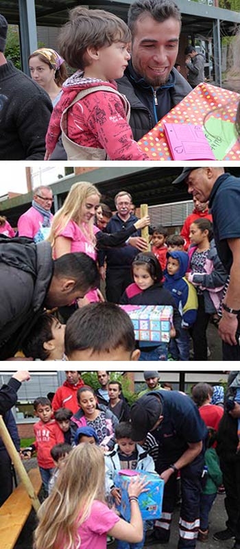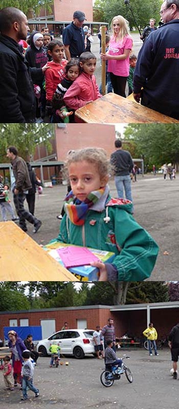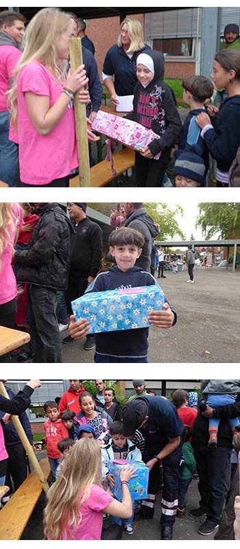 40 Kinder, die vorübergehend angekommen sind in der Außenstelle vom Erstaufnahmelager Friedland in Rosdorf bei Göttingen, in Deutschland. Wir konnten ihnen heute mit Eurer Hilfe eine Freude bringen. Sie haben alle eines Eurer Pakete erhalten und wir haben gesehen, wie sie lachten. Danke, dass du das möglich gemacht hast, danke an alle von Euch, die ihr uns Päckchen, Glückspakete schickt, die wir an die Flüchtlingskinder verteilen. Alles zu unserer Aktion, die natürlich weiter geht, findest du in der rechten Splate. Und ich würde mich sehr freuen, wenn auch du uns noch ein Päckchen schickst oder in deiner Stadt einem Flüchtlingskind eine Freude bereitest. Wir bringen auch die anderen Päckchen, die noch im Verlag stehen, in den nächsten Wochen zu den Kindern!